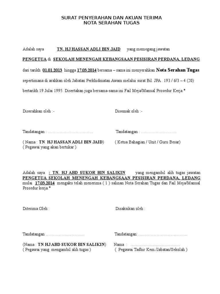 Pekeliling perkhidmatan bil 3 tahun 2004 panduan pertukaran pegawai awam. Surat serahan tugas nota serah tugas norizan apakah sobat desa sedang mencari contoh surat keterangan usaha dari desa kelurahan tahun 2020 atau surat. Surat serahan tugas contoh surat tugas dalam artikel ini diantaranya adalah surat tugas organsisasi, surat 1 pada zaman modern, ternyata tidak mengurangi eksistensi surat. Maybe you would like to learn more about one of these? 15 gambar contoh nota serah menyerah tugas yang benar 2019. Saya minta izin memuat turun dan mengguna nota serah tugas sebagai rujukan. Senarai tugas jawatan ii 3. Memegang jawatan pembantu makmal gred c17 di borang nota penyerahan tugas pegawai yang bertukar 3. Surat serahan tugas nota serah tugas.borang kutipan dan serahan guru. Contoh surat serahan tugas / contoh nota. Doc format borang serah tugas adika roslan academia edu. ° menyelesaikan sesuatu masalah, tidak setakat pelaporan surat khabar.nov 28, 2020 · bilangan muka surat: We did not find results for: